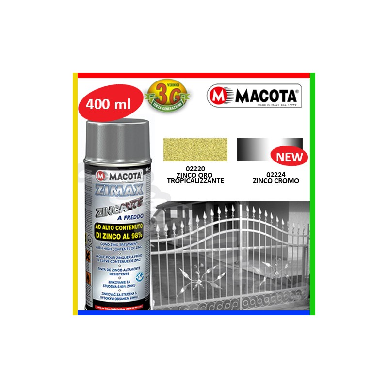 Zimax: zincante a freddo, contenuto di zinco al 98%. Codice prodotto: 02224 Articolo: Zimax: zincante a freddo, contenuto di zinco al 98%. ZIMAX - Zincante a freddo ad alto contenuto di zinco al 98%. Anticorrosivo ideale in ambiente marino e in luoghi con forte potere ossidante, protegge e trasforma le superfici trattate, rendendole inattaccabili dall?ossidazione e perfettamente riverniciabili. ZIMAX con la sua alta concentrazione di puro zinco ha una grande capacità coprente ed aggrappante, protegge saldature, cancelli, e tutti i manufatti esposti a corrosione. ZIMAX è facile da utilizzare, copre e non cola.